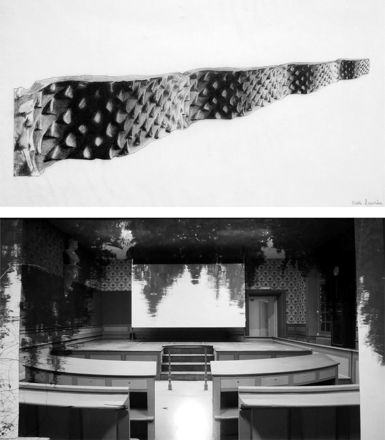 De har var sitt rum i galleriet, det första tillägnat Beth Laurin med ett urval av fem verk på papper som spänner mellan åren 1965 till 1980. Lina Selanders rum innehåller två filminstallationer från 2013 och 2015/2016.